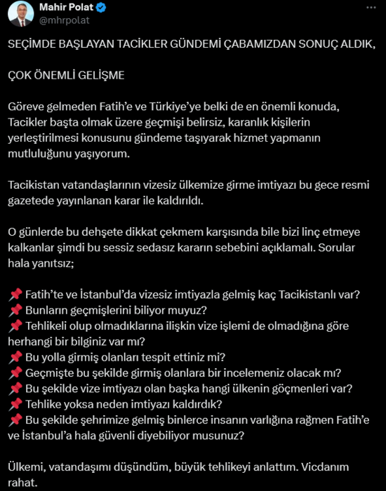 “Before taking office, I am pleased to serve Fatih and Turkey in perhaps the most important matter by addressing the issue of settling unknown, shady individuals, especially Tajiks, on the agenda. The privilege of Tajik citizens to enter our country without a visa has been abolished with the decision published in the official gazette this evening.”