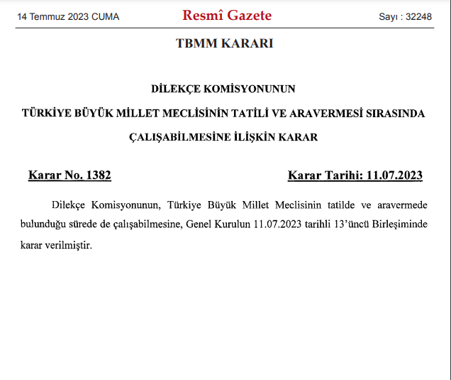 „ „Auf der 13. Sitzung des Generalrats vom 11.07.2023 wurde beschlossen, dass der Petitionsausschuss während der Pause und Vertagung der Großen Türkischen Nationalversammlung arbeiten kann.“
